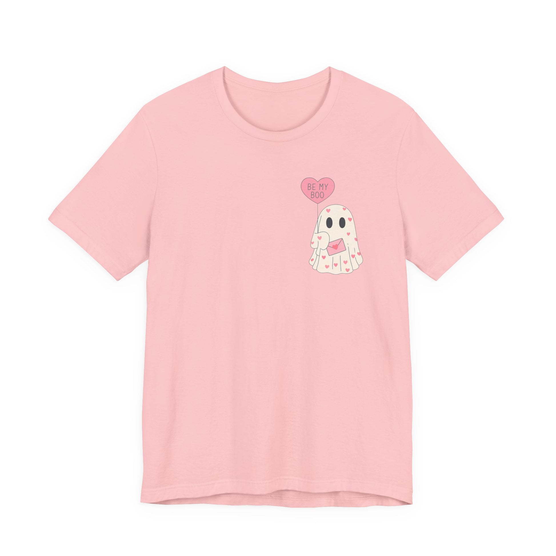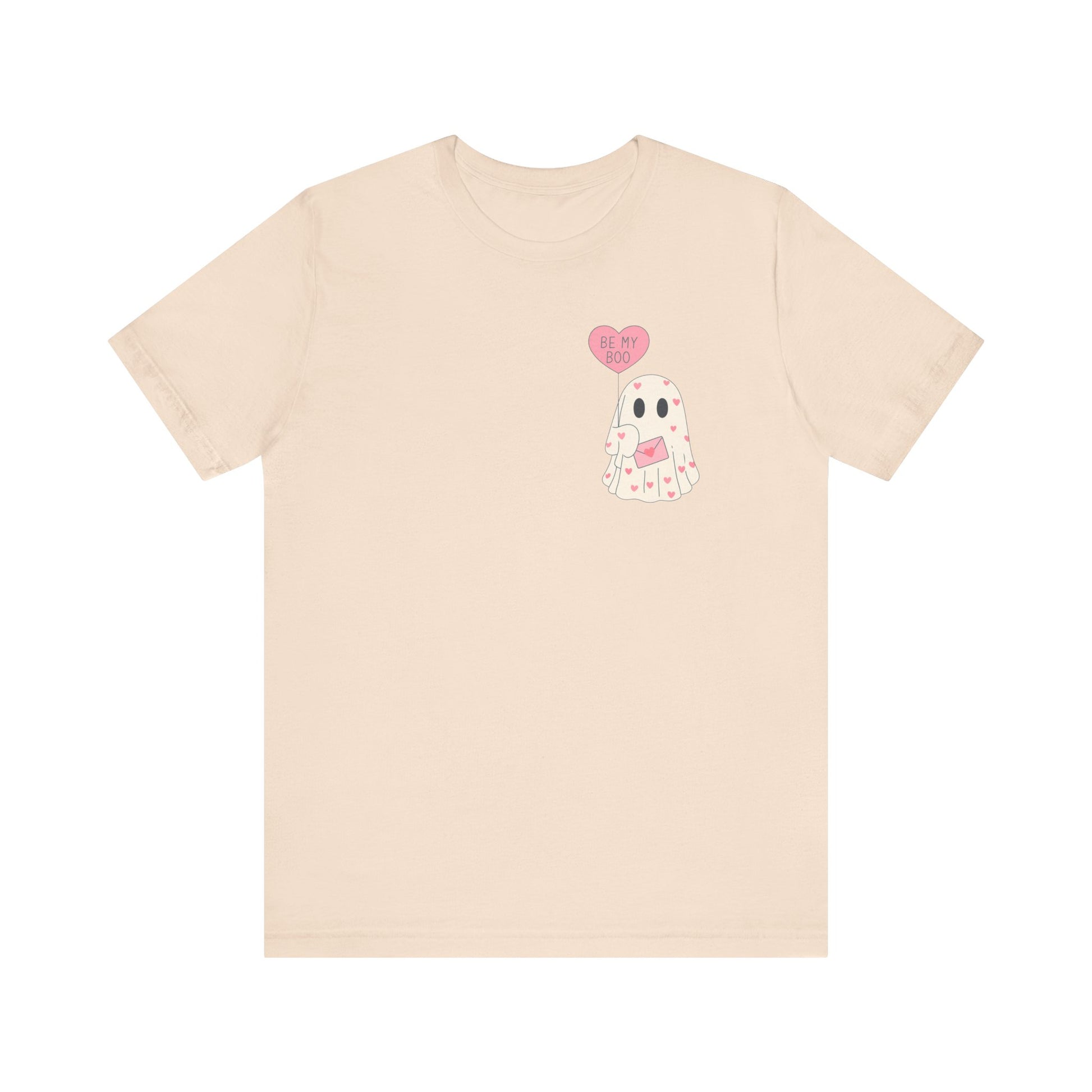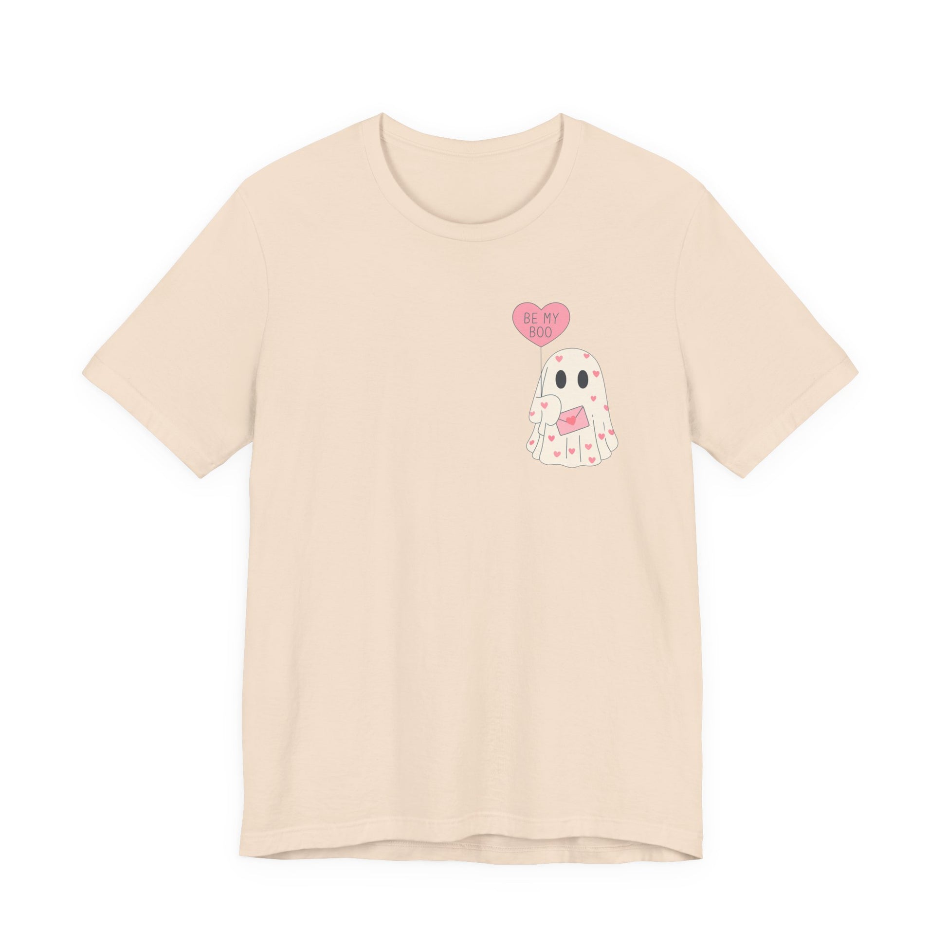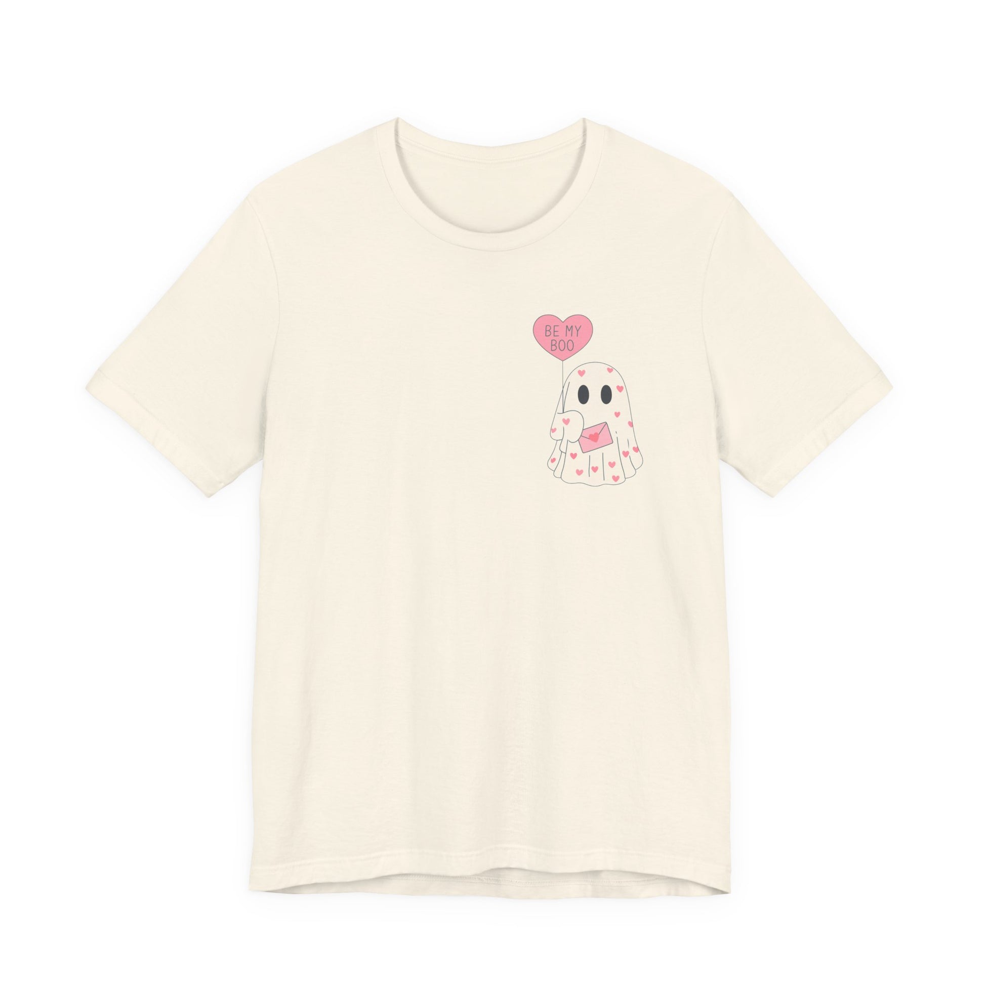 Soft, playful, and quietly spooky — this lightweight jersey tee carries a tiny valentine with a wink. A hand-drawn ghost floats across the chest, clutching a heart-shaped balloon that reads “be mine.” Wear it to cozy up on low-key date nights, wander through neighborhood parties, or tuck under a cardigan for a casual nod to the season. The silhouette is familiar and easy: neat crew neck, clean side seams, and a retail fit that sits just right whether you’re running errands or staying in to watch scary-romantic movies. The design reads like a private note — sweet, a little cheeky, and made to be worn by someone who likes their romance with a hint of mischief.